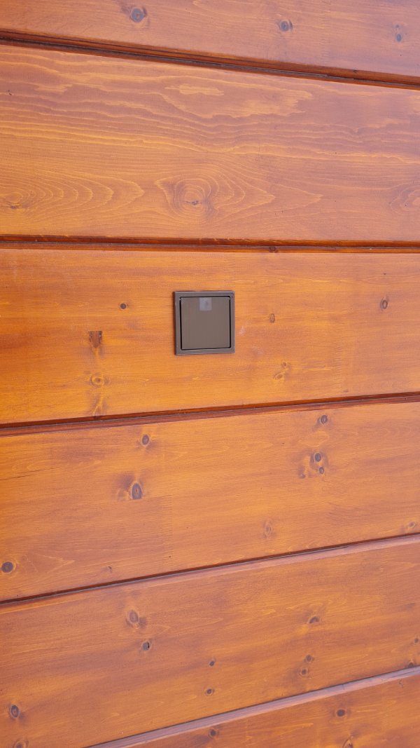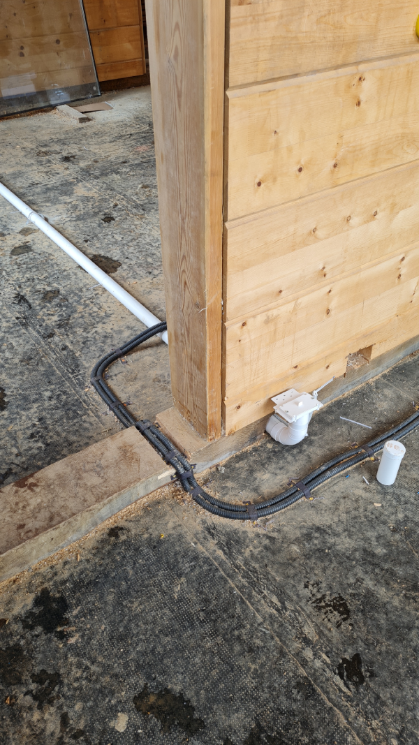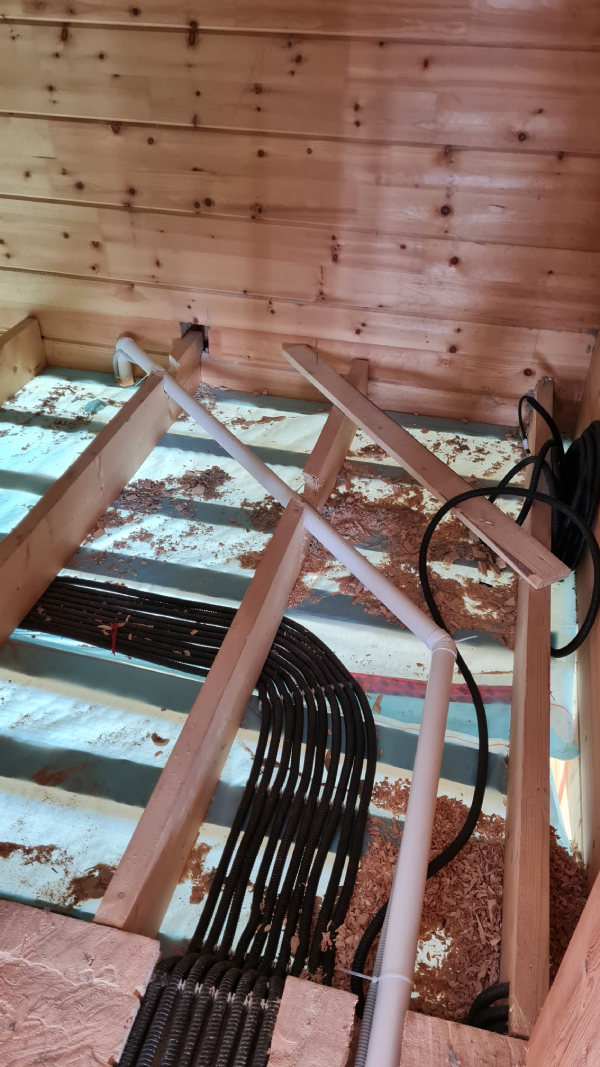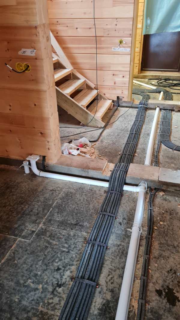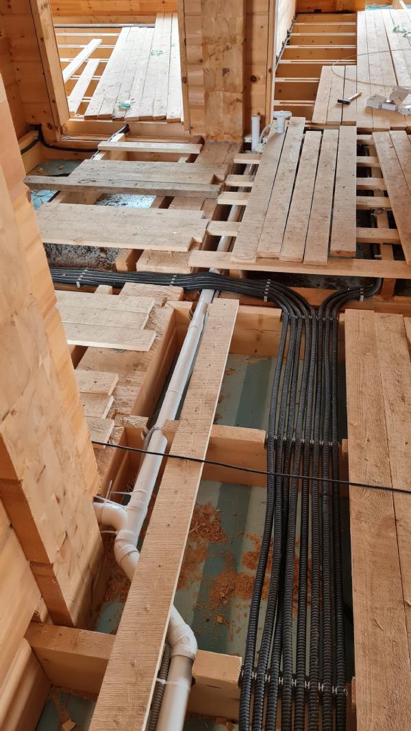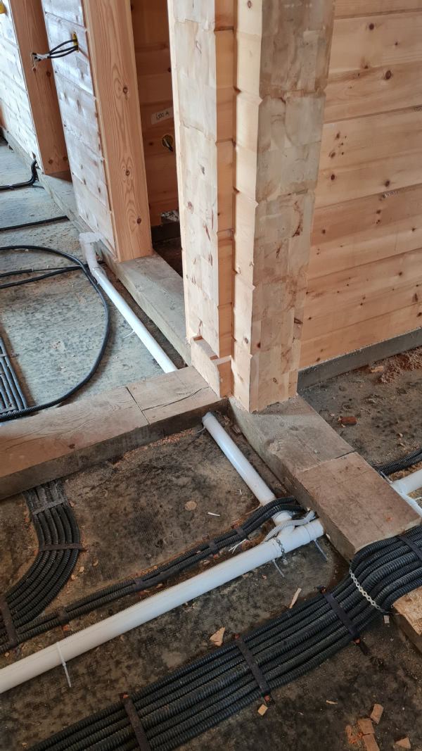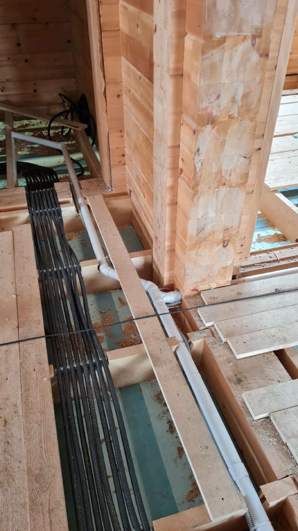 En la planta baja se instaló un recorrido (sistema de tuberías) en el suelo en bruto antes de colocar el aislamiento y la calefacción por suelo radiante, con piezas de montaje de tomas neumáticas. Como la casa es de madera y no era posible instalar tomas neumáticas murales en los tabiques de madera, se acordó con el cliente instalar tomas neumáticas especiales montadas en el suelo.