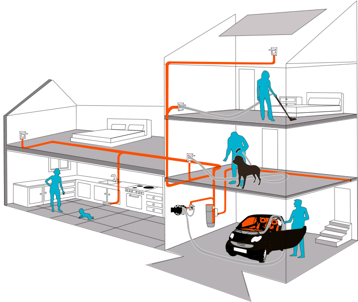 La unidad central de aspiración, está conectada mediante una red de tuberías, a las tomas de aspiración situadas por toda la casa. La manguera conectada arrastrará el polvo y los residuos através de las tuberías, que serán filtrados por un sistema de filtrado de 3 etapas y conducido el escape al exterior de la casa.