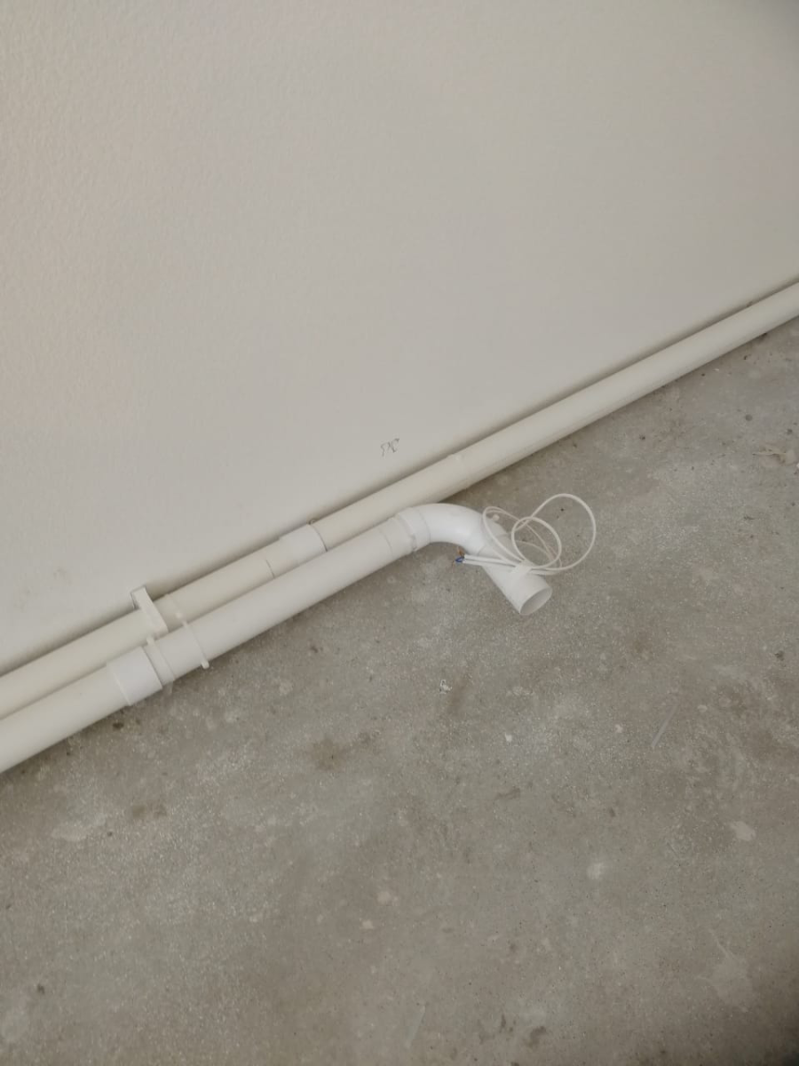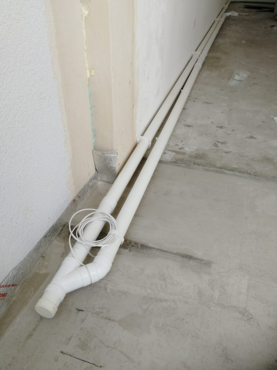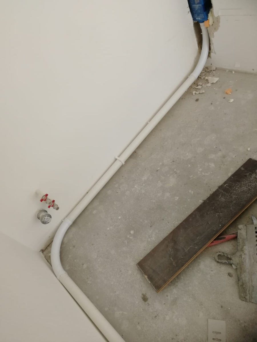 Como ya no era posible hacer penetraciones en el suelo para el trazado del sistema, propusimos al cliente colocar las tuberías a lo largo de las paredes de la zona de la cocina.