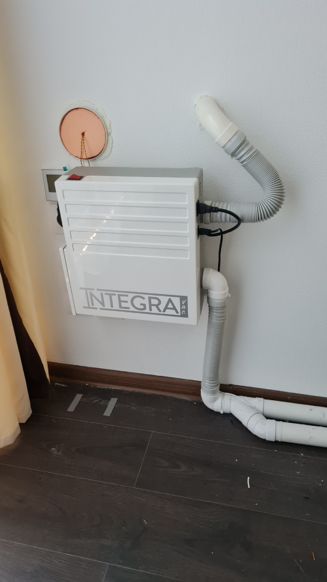 Después de que el cliente hubiera colocado el suelo y acabado las paredes, se instaló la unidad de potencia compacta INTEGRAVAC en la pared de la zona de la cocina, que posteriormente se instalará en el interior de los muebles de cocina.